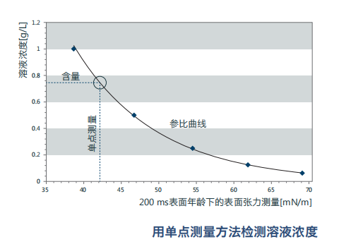 動態(tài)表面張力對溶液內(nèi)的表面活性劑濃度變化非常敏感,采用BP100您就能根據(jù)這種關(guān)系快速確定您的表面活性劑 濃度是否在所需的范圍中,這在電鍍和清洗行業(yè)已經(jīng)被廣泛應(yīng)用。在使用這種方法前,您僅需用單點(diǎn)測量的方法在該表面活性劑溶液的不同濃度范圍內(nèi)建立的參考曲線即可。